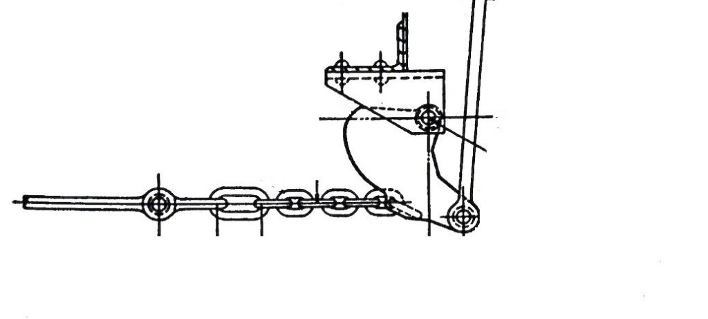 Fixação da corrente (4) – A corrente que faz parte do tirante vertical, é presa à engrenagem maior no ponto indicado na figura. É neste local que ao girarmos o volante, a corrente será enrolada no interior da caixa, puxando para cima o tirante vertical. Por definição de projeto e de normalização, a distância entre este ponto de fixação e o centro da caixa, onde é feito o somatório dos momentos atuantes, é de 44,4mm (1.3/4″).