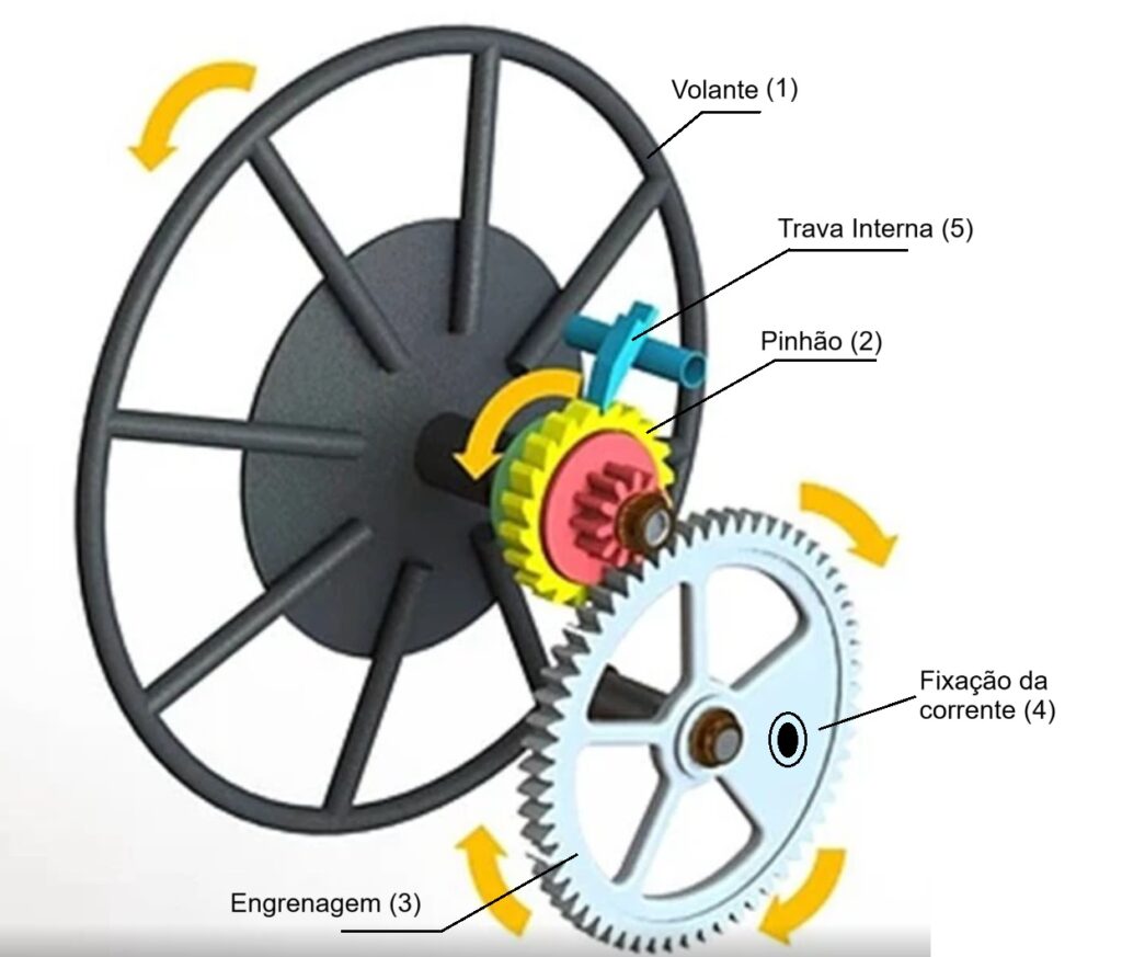 Pinhão (2) – O pinhão preso ao volante de freio, recebe o momento gerado pela aplicação da força de 56,7 kgf no braço de alavanca do raio do volante que é de 280mm (11″). Sua função será a de transmitir tal momento para o restante dos componentes, estando seus 11 dentes conectados com os dentes da engrenagem interna onde está fixada a corrente de atuação.