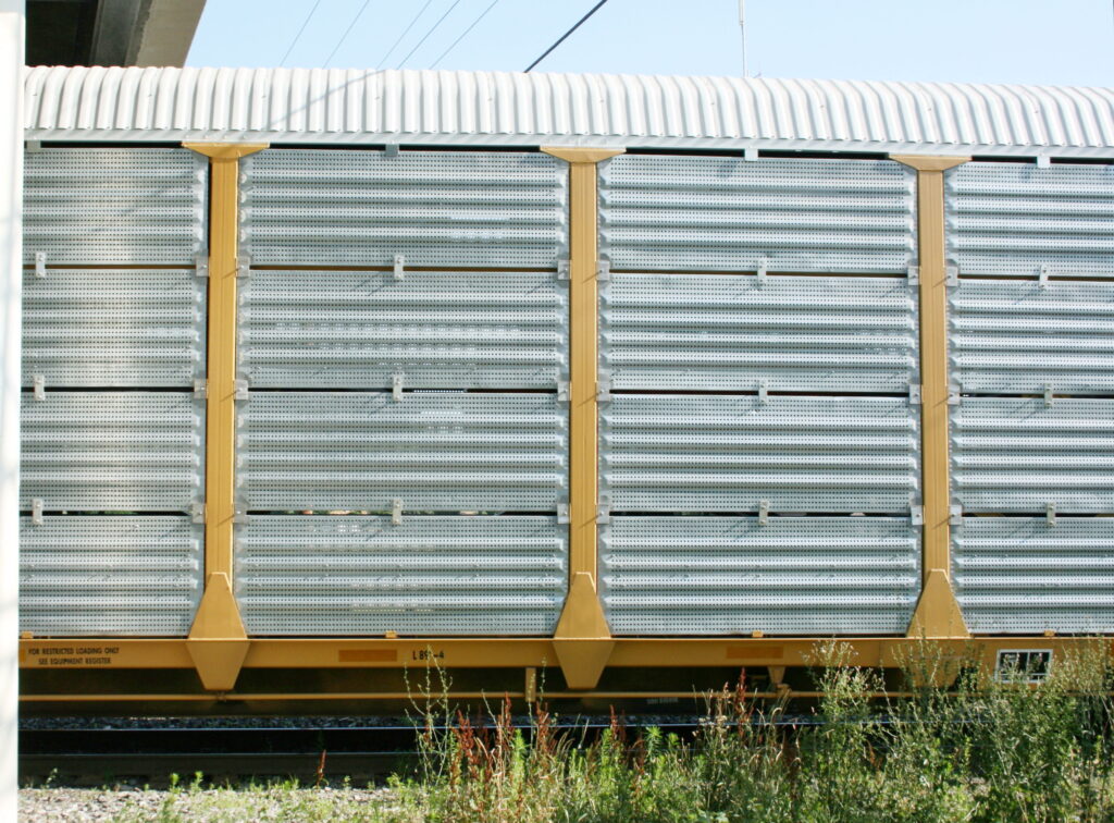 Fig. 6 – Nível de carga de um Autorack mostrando as fixações e as proteções das portas dos carros na cor branca (fonte Railcarphotos)