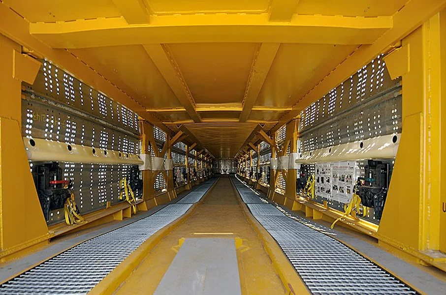 Além da padronização dimensional que se tornou importante na transferência de carros entre terminais, alguns componentes dos vagões também sofreram revisão no seu conceito. Um grande exemplo disso foram as portas de extremidade, as quais possuem grande variedade no seu projeto, podendo ser dobráveis ou pivotadas nas extremidades para poderem dar livre acesso de entrada e saída dos carros em cada nível interno de transporte. Na Figura 4, vemos dois exemplos destas portas, hoje as mais aplicadas.