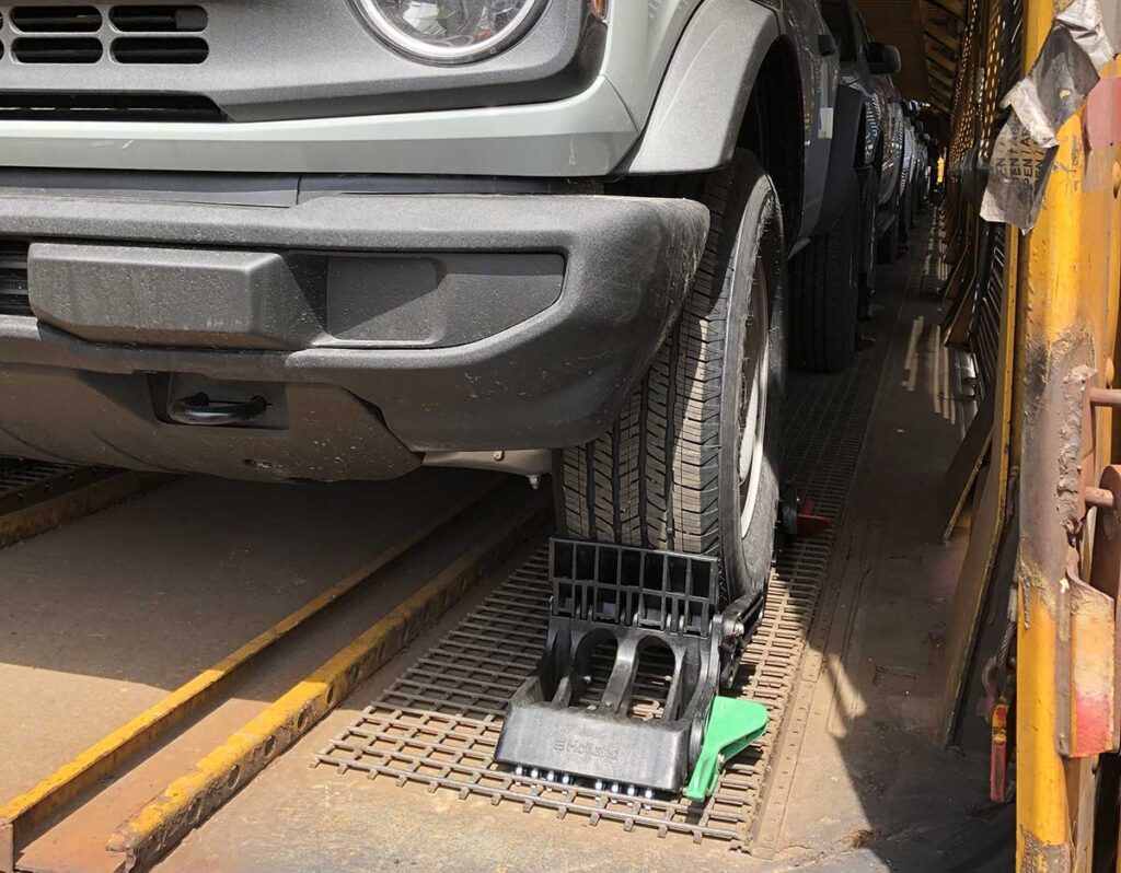 Falando agora do interior destes grandes vagões e de algumas de suas particularidades, vamos iniciar destacando a primeira delas que é a fixação dos automóveis nos assoalhos dos níveis de carregamento. Duas das mais usadas hoje são a aplicação de travas de rodas presas sobre um piso gradeado e outra pela amarração dos pneus em trilhos perfurados soldados nos pisos, ajustados por um tipo de catraca. Ambas as travas são muito eficientes e realmente prendem os automóveis de forma que eles não se soltem de suas posições mesmo em caso de tombamento dos vagões quando de acidentes.