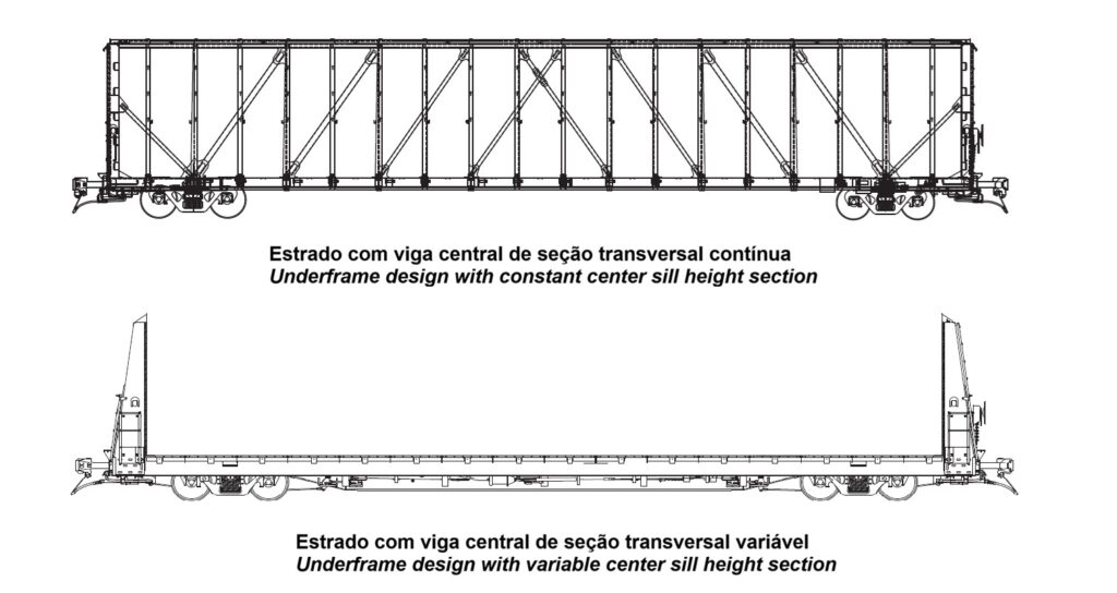 Vamos lembrar que os Centerbeams foram desenhados para otimizar o transporte de madeira de construção e não qualquer tipo de carga geral, ou seja, um estrado de plataforma com características ditas normais, teria uma viga central com inércia variável para poder absorver os esforços verticais e longitudinais, porém com muito mais peso (tara) para puxar para baixo o centro de gravidade do vagão e com isso controlar a relação de forças L / V sobre as rodas.