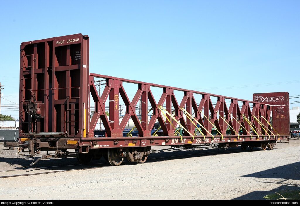 Vamos dar prosseguimento ao trabalho descritivo dos tipos de vagões que não rodam no Brasil, falando agora dos CENTERBEAMS, que na realidade pertencem à família dos vagões plataforma com anteparos de cabeceira. A grande diferença básica que os distinguem dos irmãos tradicionais é a grande treliça localizada sobre a viga central ao longo de todo o comprimento útil do estrado, como se observa na imagem de referência.