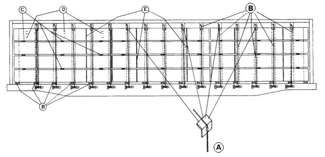 Recentemente me perguntaram se uma carga aplicada sobre um estrado dividido ao meio e com possibilidade de trombamento lateral não precisaria de algum tipo de amarração. A resposta é certamente positiva, ou seja, os pacotes após serem posicionados sem folgas que venham a causar impactos e deslocamentos, são amarrados com cabos de aço ajustáveis com catracas posicionadas nas vigas laterais do estrado. Logo que as duas empilhadeiras concluem o trabalho, uma série de funcionários passa os cabos de baixo para cima, prendendo-os no tôpo da treliça, ajustando-os na base para que fiquem bem esticados e firmes. Desta forma, não haverá qualquer perigo de soltura ou queda em viagem, o que seria catastrófico pois certamente este efeito também poderia tombar o vagão. Na Figura 9, a seguir vemos o esquema de amarração seguida para a fixação da carga nos vagões Centerbeam.